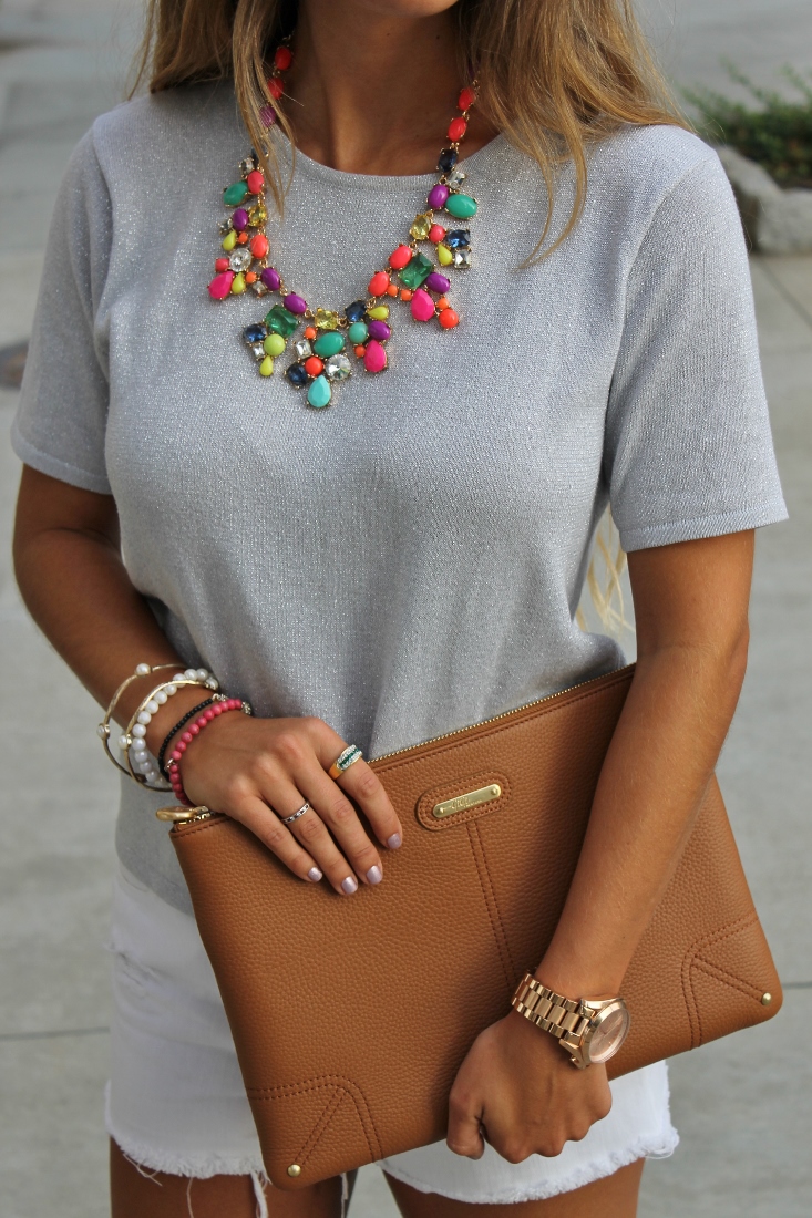 A statement necklace, essentially a necklace that has big eye-catching elements to it, is a great addition to an otherwise very simple outfit. T-shirts, sweaters, even simple sweatshirts can look put together and chic by adding a necklace that brings attention to the neckline. I will often add a statement necklace over a sweater and black leggings when running out the door last minute .